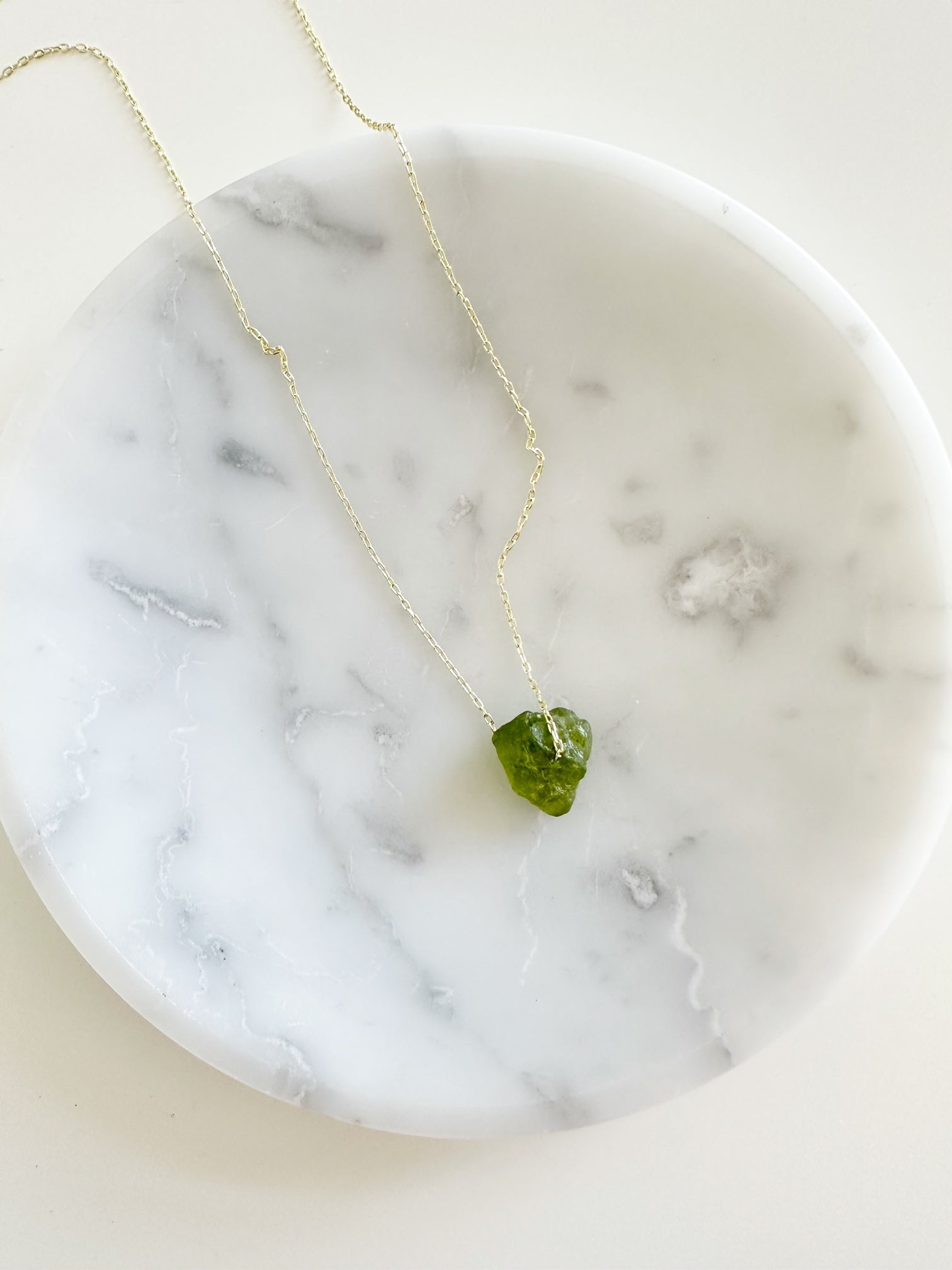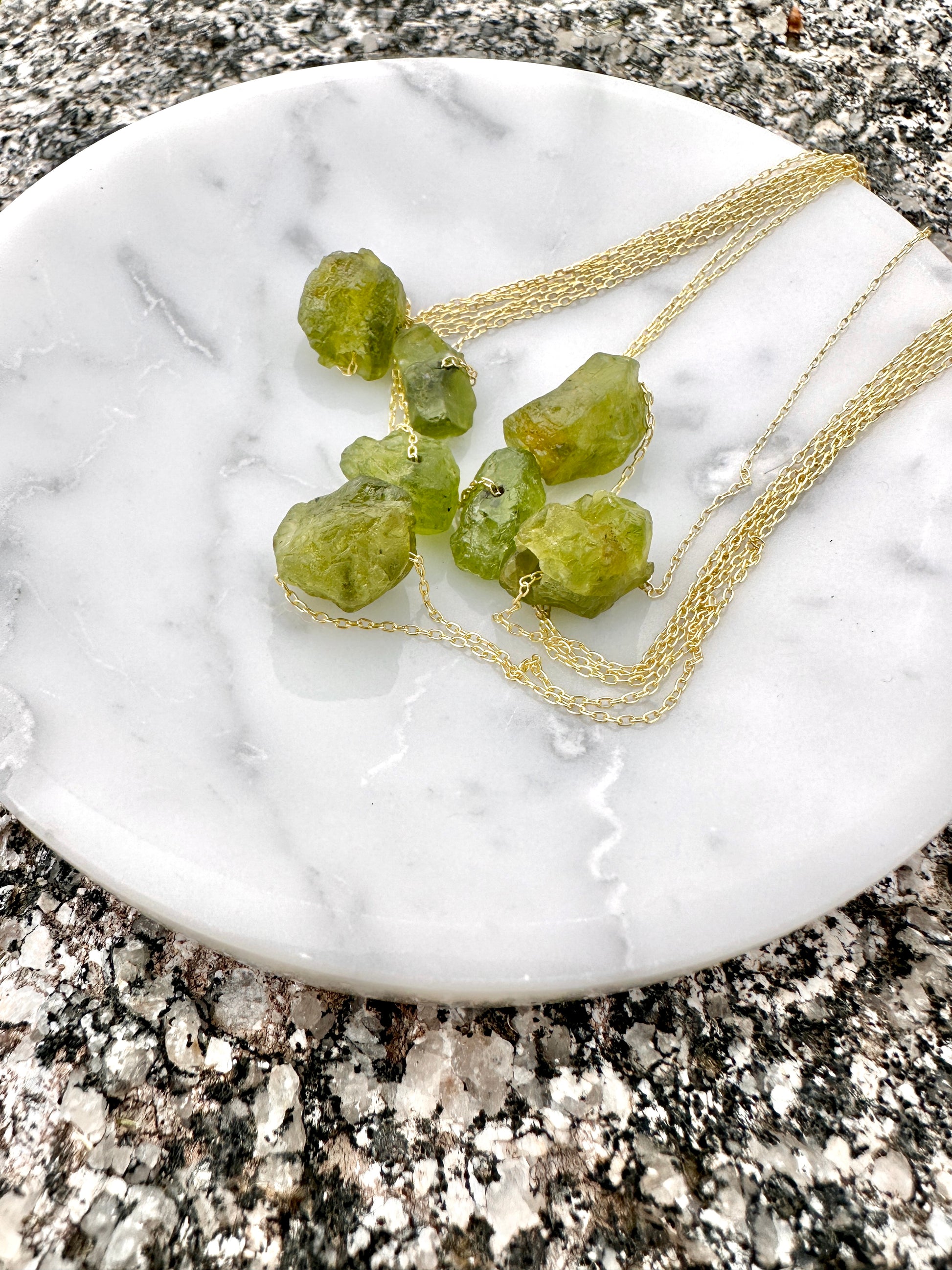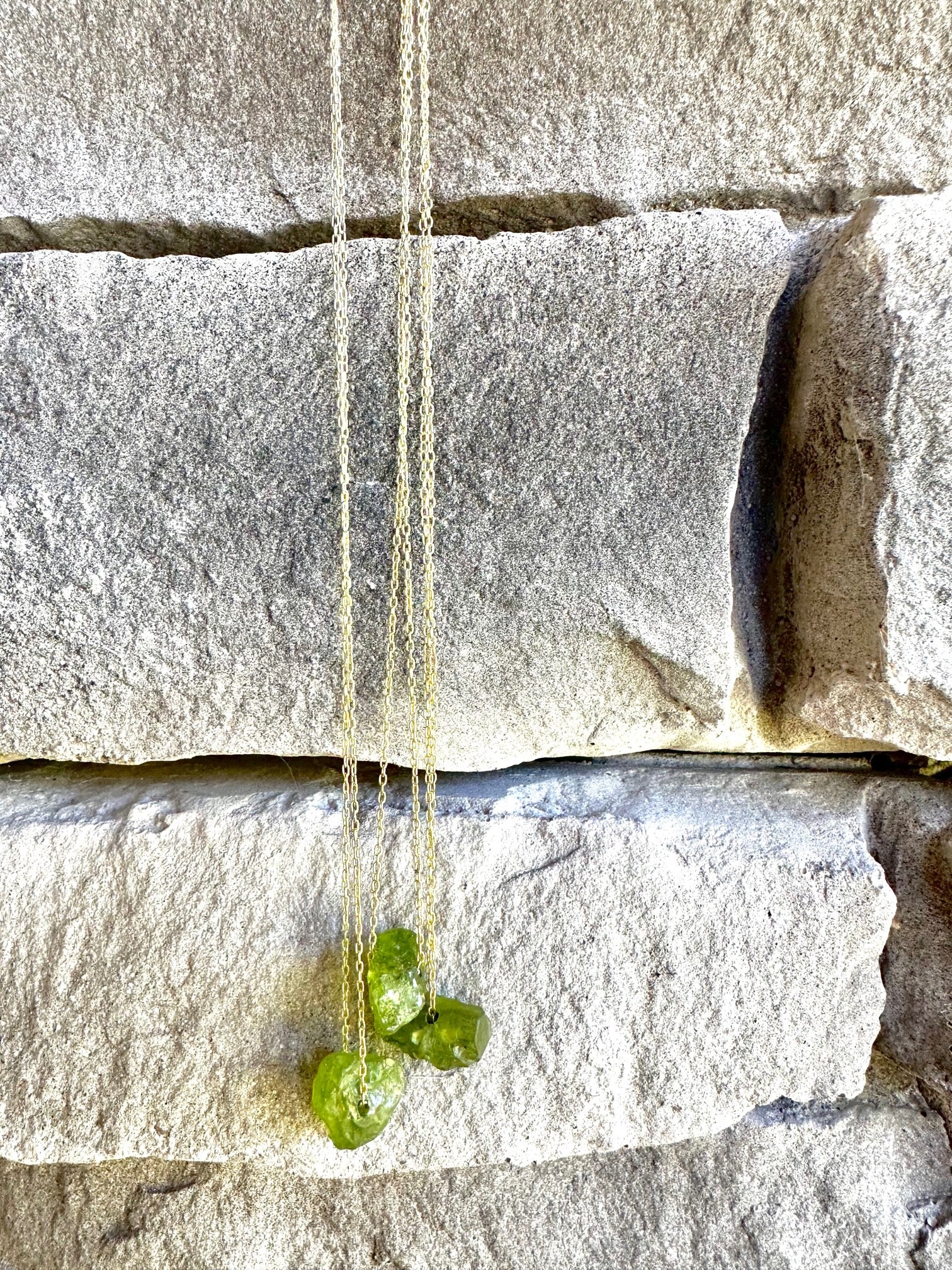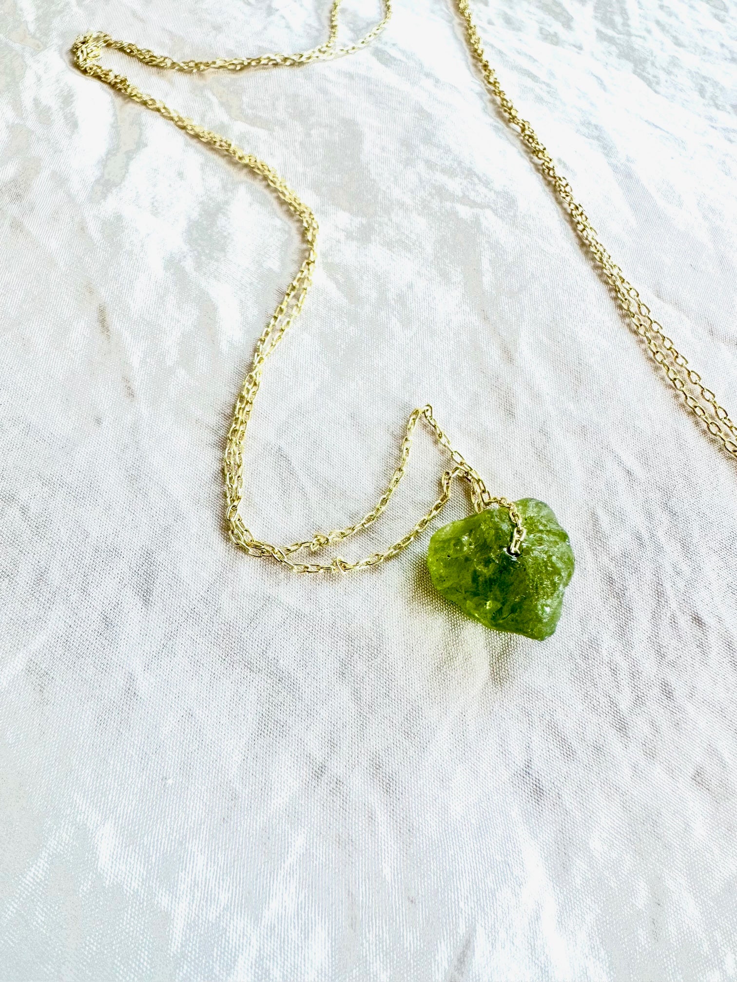 Rough peridot, aquamarine, or garnet gemstone on a 16" gold-filled or sterling silver chain.