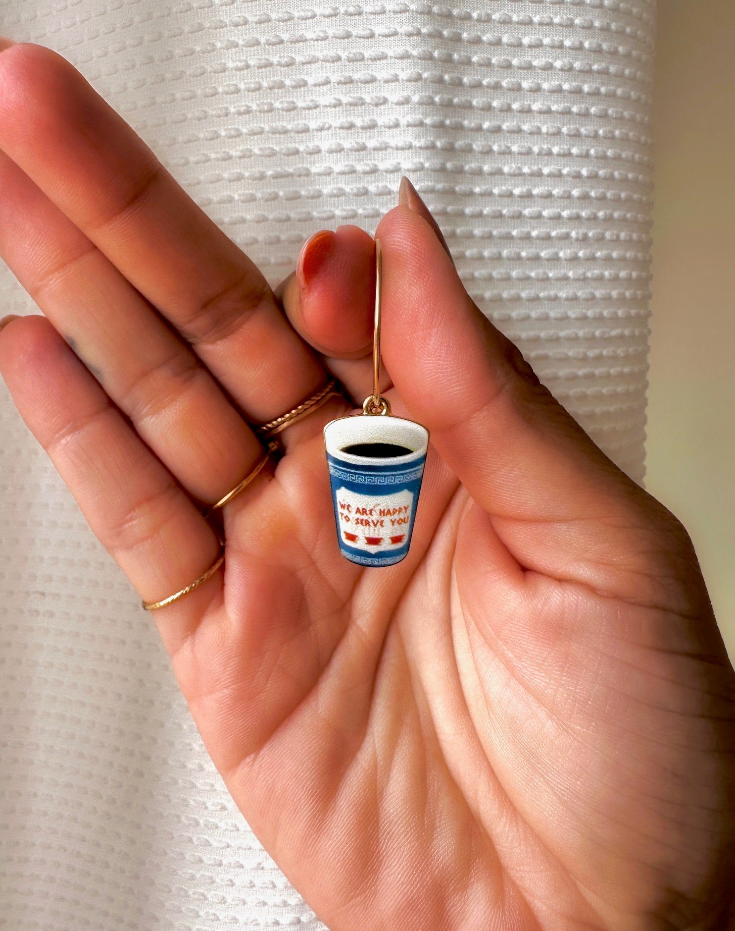 For the caffeine-addicted New Yorker in all of us :) Light and comfy 20mm gold-filled hoops with enamel NYC coffee cups.